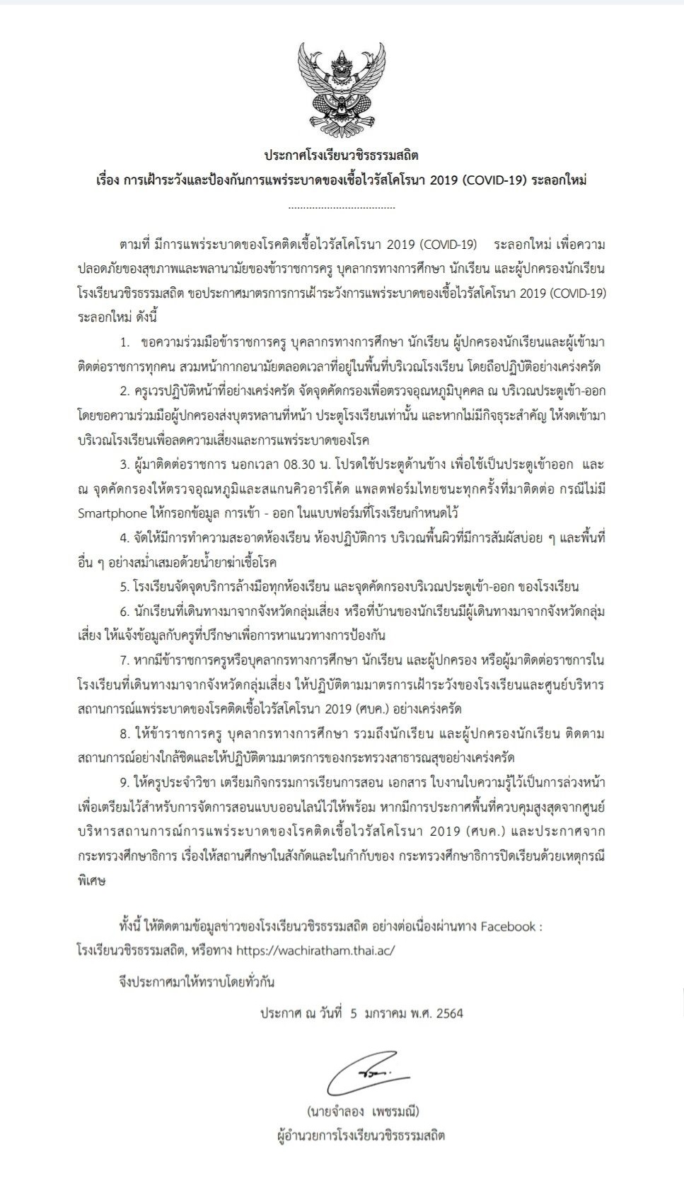 ประกาศโรงเรียนวชิรธรรมสถิต เรื่อง การเฝ้าระวังและป้องกันการแพร่ระบาดของเชื้อไวรัสโคโรนา 2019 (COVID-19) ระลอกใหม่