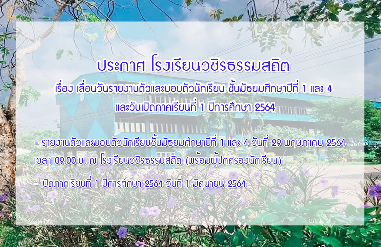 ประกาศโรงเรียนวชิรธรรมสถิต เรื่อง เลื่อนวันรายงานตัวและมอบตัวนักเรียน ชั้นมัธยมศึกษาปีที่ 1 และ 4 และวันเปิดภาคเรียนที่ 1 ปีการศึกษา 2564