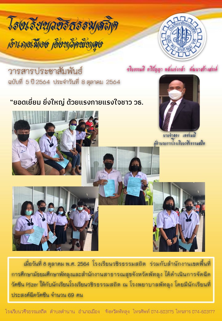 โรงเรียนวชิรธรรมสถิต นำนักเรียนฉีดวัคซีน Pfizer นักเรียนรอบที่ 1 อายุ 12-18 ปี ณ โรงพยาบาลพัทลุง จำนวน 69 คน โดยการนำของคุณครู ศิริวรรณ ญาณสังฆพันธ์