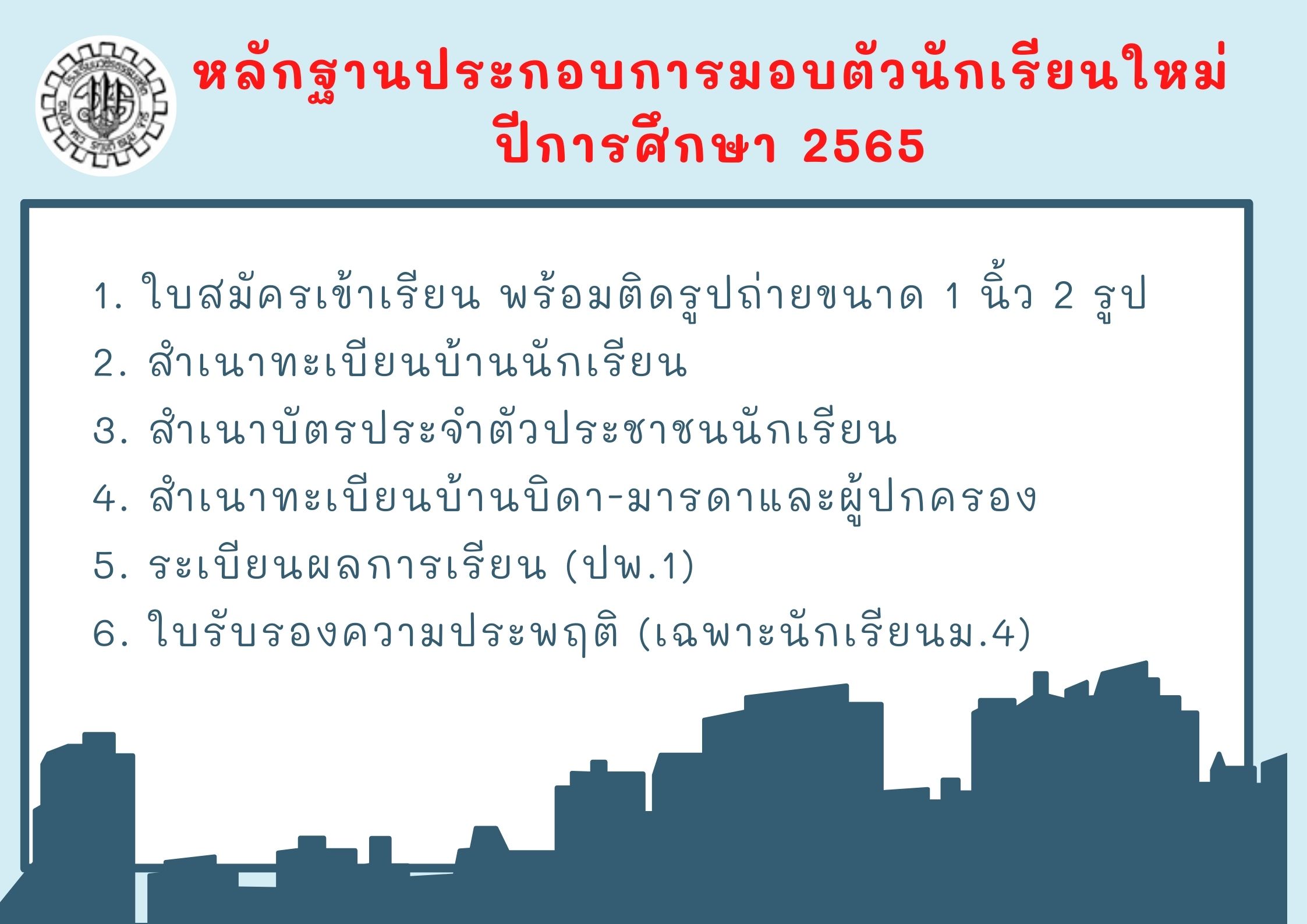 เอกสารและหลักฐานที่ใช้ประกอบการมอบตัวนักเรียนใหม่ ปีการศึกษา 2565