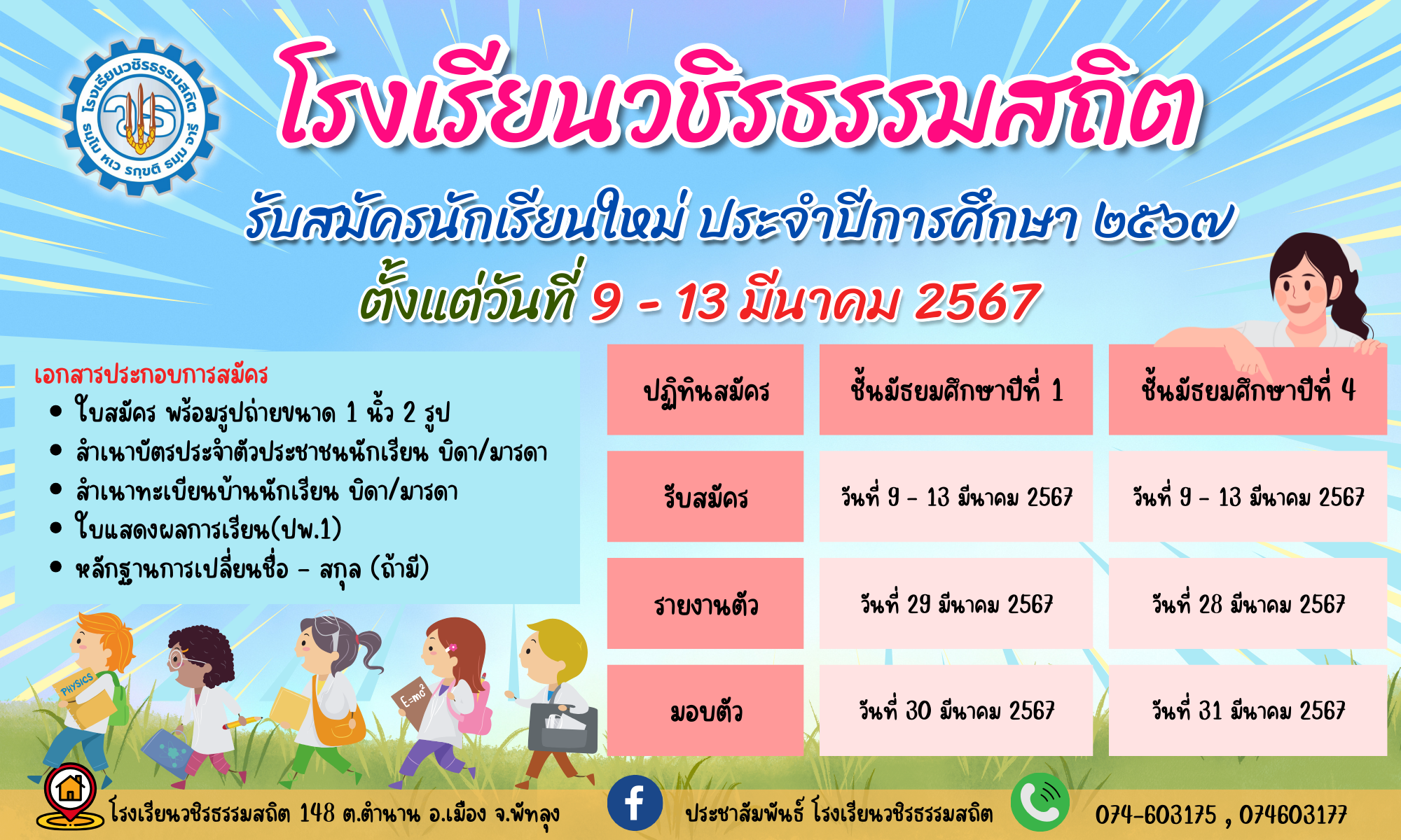 โรงเรียนวชิรธรรมสถิต รับสมัครนักเรียนใหม่ ปีการศึกษา ๒๕๖๗
